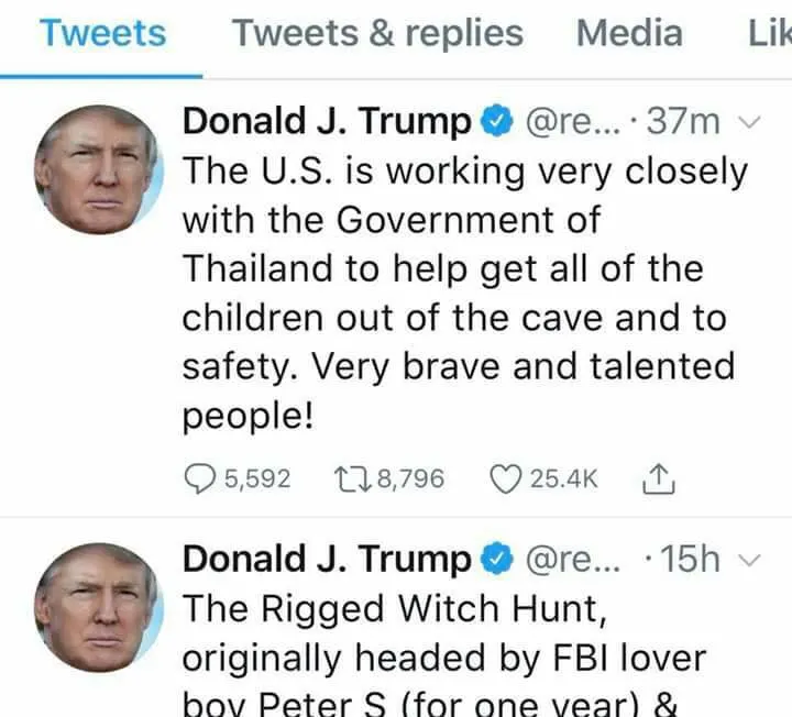 ด้าน Donald Trump” ทวีตการข่วย ”ทีมหมูป่าฯ”ออกจากถ้ำหลวง ชี้สหรัฐฯร่วมทำงานกับรัฐบาลไทยอย่างใกล้ชิด เพื่อช่วยเด็กๆออกจากถ้ำอย่างปลอดภัย ชมกล้าหาญและ มีความสามารถ