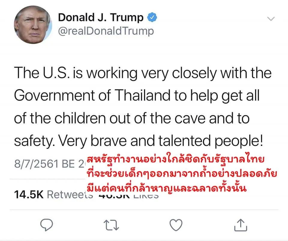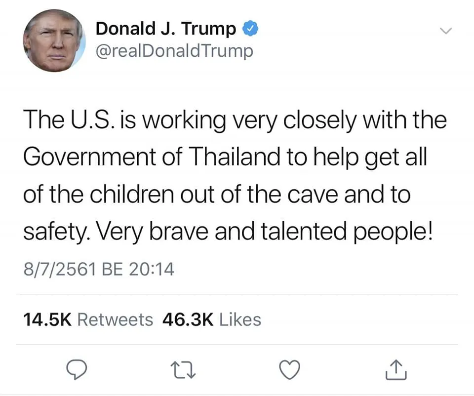 "ทรัมป์"ทวีตข้อความ สหรัฐได้ทำงานใกล้ชิดกับไทย "ช่วยหมูป่า" ด้านชาวเน็ตขำคนที่มาตอบทวีต!