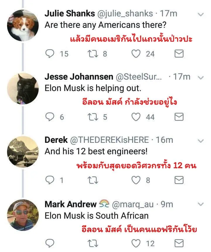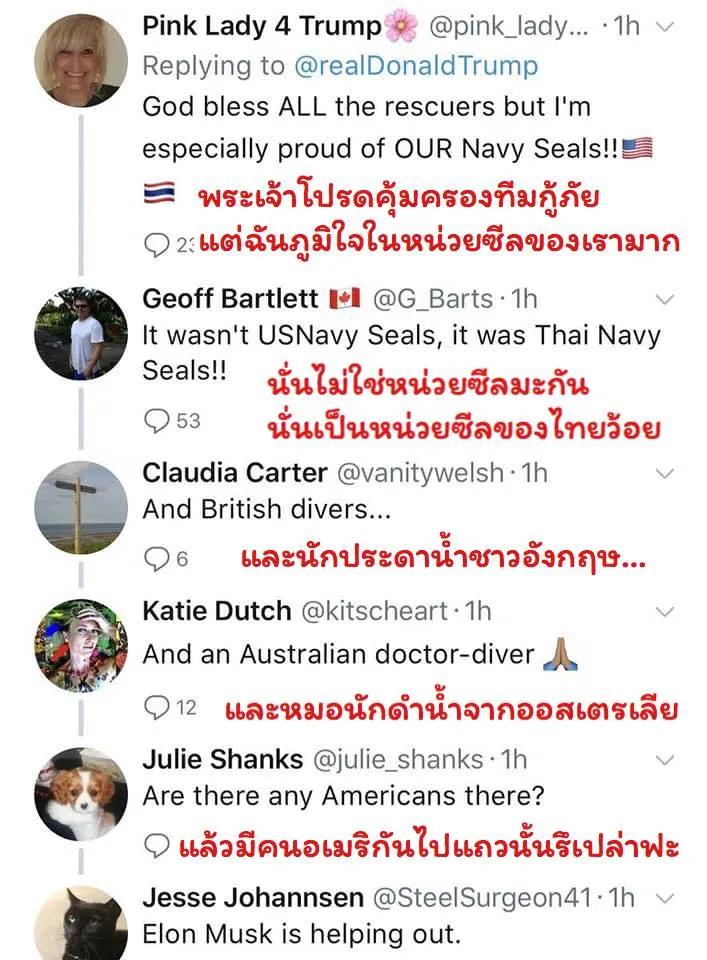 ซึ่งหลายคนที่ติดตามข่าวถ้ำหลวงถึงกับขำ! ที่ทรัมป์และชาวเน็ตที่เข้ามาตอบทวีตบางส่วนได้"ปล่อยไก่ " บางคนบอกว่า ภูมิใจในหน่วยซีลของอเมริกันมาก แต่เดี๋ยวนะ! นั่นซีลของไทยไม่ใช่เหรอ? และคนต่างชาติเป็นนักประดาน้ำ เขามาจากอังฤษแถมไม่ใช่หน่วยซีลด้วย