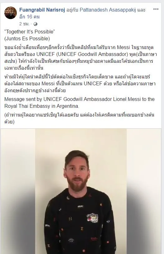 Message sent by UNICEF Goodwill Ambassador Lionel Messi to the Royal Thai Embassy in Argentina.”