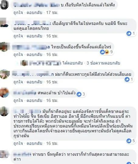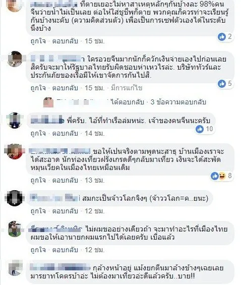 ต้องรีบทำด่วนให้จีนเห็นความจริงใจรัฐบาลไทยเรา แก้ไขจัดการอย่างเต็มที่ก่อนสายไปเกินแก้ไขให้กลับมาดี ยอมเสียน้อยดีกว่าเสียหายทั้งหมดโปรดอย่ามองมุมเดียว เหรียญมีสองด้าน อ่านแล้วคิดในเสียย่อมมีดี ในดีอาจมีเสีย อยู่ที่มุมมองคนเราอย่าคิดอคติกันทำอะไรที่ให้ความจริงใจความรู้สึกดีๆแก่คนจีนย่อมดีกว่าไม่มีใครอยากให้เกิดเรื่องแบบนี้ขึ้นในไทยเรา คนจีนเขามาตายจำนวนมาก อย่าลืมจีนเป็นมิตรประเทศไทยเคยช่วยเหลือเราเหมือนกัน