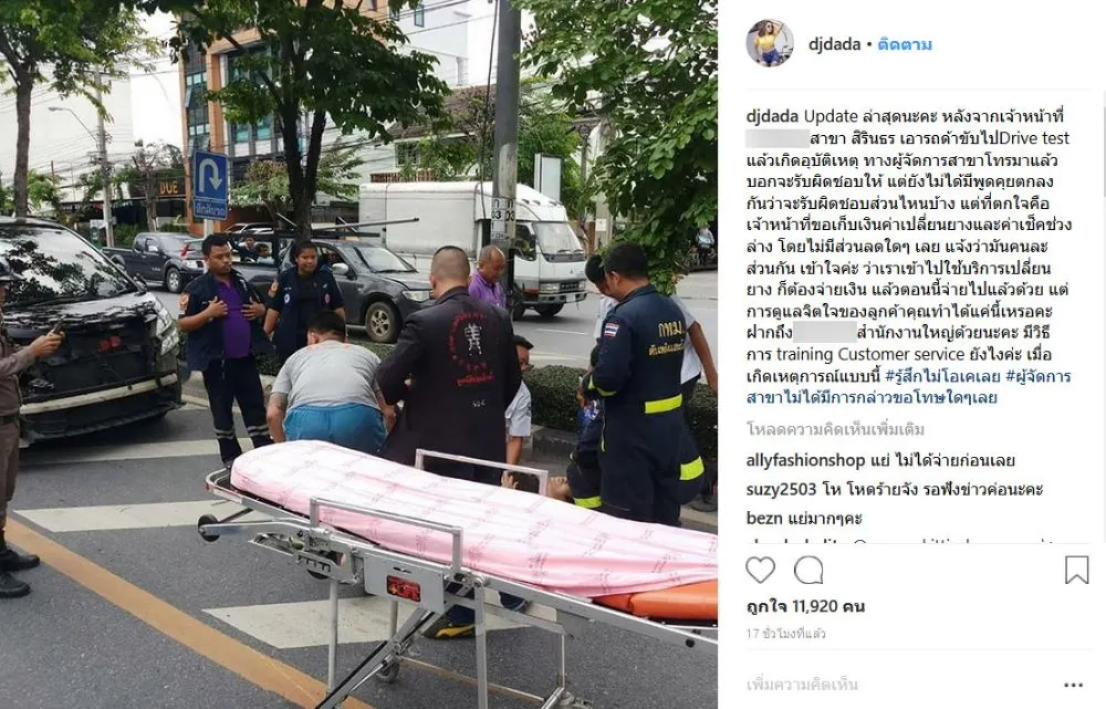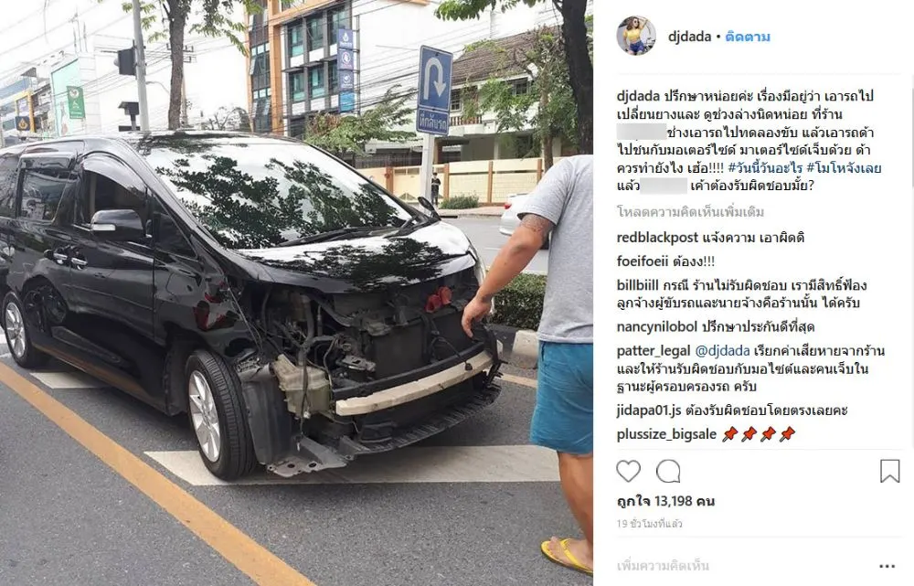 ดีเจดาด้า ปรี๊ดเอารถไปเปลี่ยนยางร้านชื่อดัง แต่ช่างเอาไปลองขับชนยับแถมมีคนเจ็บ