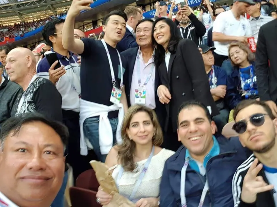 คนลาวถ่ายภาพคู่ "ทักษิณ-ยิ่งลักษณ์" ขณะไปชมบอลโลกคู่ อังกฤษ-โครเอเชีย ที่ขอบสนามรัสเซีย
