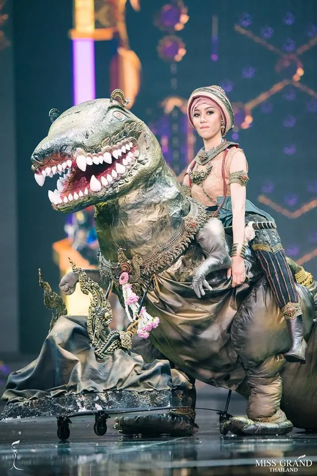 ขอนแก่นค้นพบซากดึกดำบรรพ์ไดโนเสาร์ในอำเภอภูเวียง ซึ่งมีความสำคัญแก่การเรียนรู้ประวัติและวิวัฒนาการของสิ่งมีชีวิตต่างๆบนโลก จึงได้สรรค์สร้าง ชุดประจำจังหวัดขอนแก่น เป็นสตรีขี่ไดโนเสาร์แสดงออกถึงความกล้าหาญ ความแข็งแกร่ง ล้วนแล้วเกิดจากจินตนาการ ผสมผสานความเป็นไทย ผ่านตำนานไดโนเสาร์