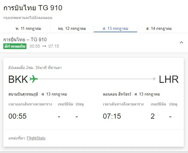 โดยจะเดินทางออกจากประเทศไทยเวลา 00.55น. และจะเดินทางถึงลอนดอนเวลา 7.15น. ตามเวลาท้องถิ่น (ลอนดอนช้าว่าไทย 6 ชั่วโมง) ขอให้ท่านเดินทางโดยสวัสดิภาพครับ