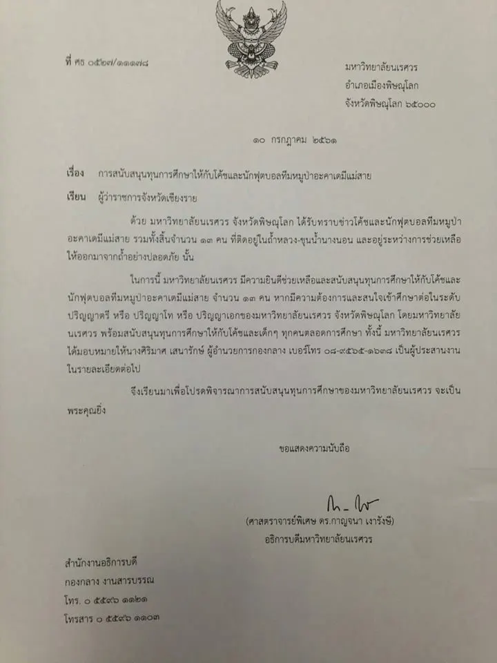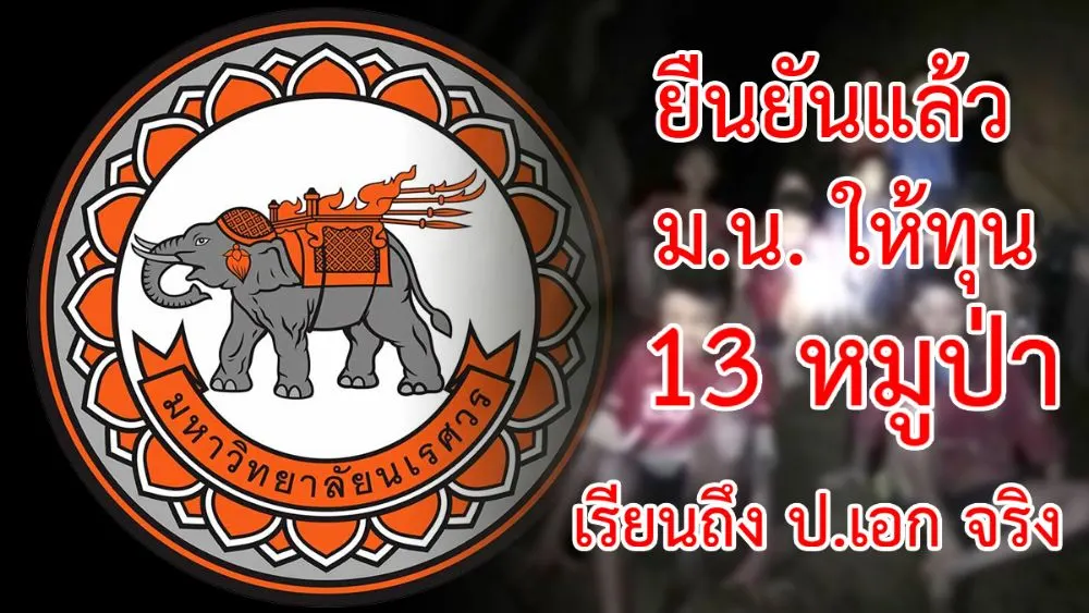 ของจริง ม.นเรศวร ยืนยันหนังสือให้ทุน 13 หมูป่า เรียนฟรีถึงปริญญาเอก เป็นของจริง