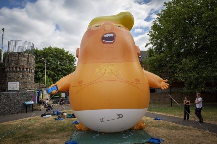 ส่วนช่วงเช้าวันพรุ่งนี้ (13 ก.ค.) ผู้ประท้วงเตรียมปล่อยบอลลูนล้อเลียนทรัมป์โดยเป็นภาพเด็กทารกที่ใบหน้าสีส้มและมีสีหน้าโมโหขึ้นลอยเหนืออาคารรัฐสภา โดยก่อนหน้านี้นายกเทศมนตรีกรุงลอนดอนมีคำสั่งห้ามปล่อยบอลลูนดังกล่าว แต่สุดท้ายก็เปลี่ยนในอนุมัติให้ทำได้หลังจากฝ่ายประท้วงรวบรวมรายชื่อผ่านเว็บไซต์ออนไลน์ได้มากกว่า 10,000 รายชื่อ