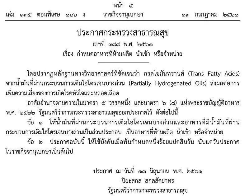 14 กรกฎาคม 2561 เว็บไซต์ราชกิจจานุเบกษา มีการประกาศกระทรวงสาธารณสุข เรื่อง กำหนดอาหารที่ห้ามผลิต นำเข้าหรือจำหน่าย มีรายละเอียดดังนี้
