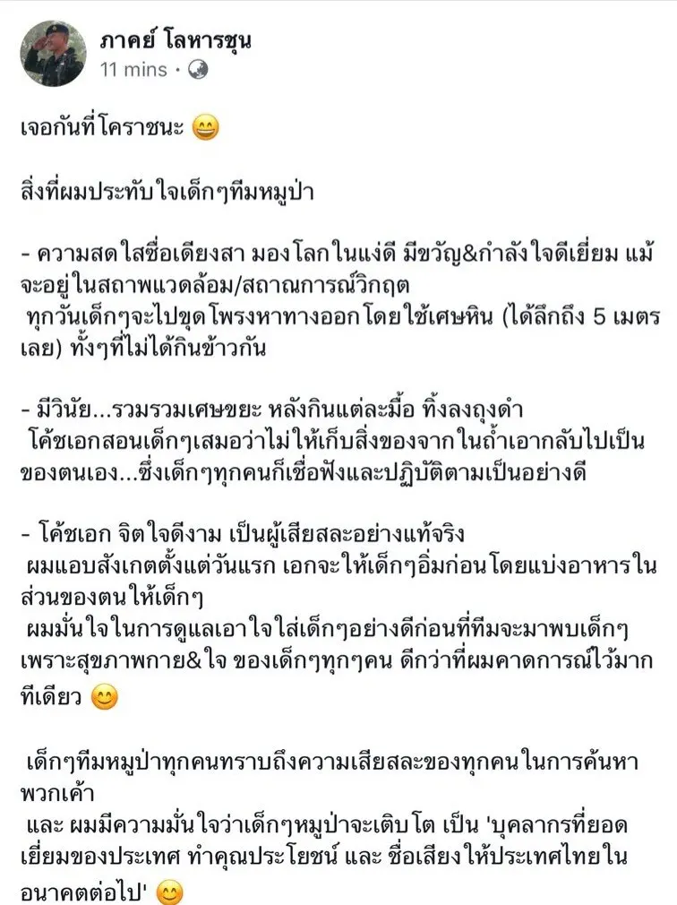 และ ผมมีความมั่นใจว่าเด็กๆหมูป่าจะเติบโต เป็น 'บุคลากรที่ยอดเยี่ยมของประเทศ ทำคุณประโยชน์ และ ชื่อเสียงให้ประเทศไทยในอนาคตต่อไป'