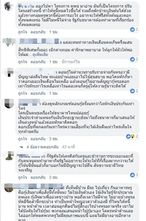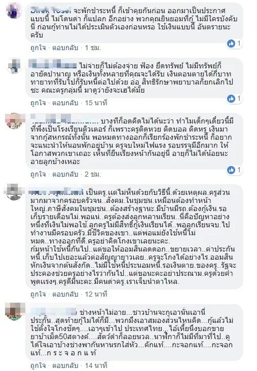คุณได้เงินได้ประโยชน์แล้ว ก็มารวมตัวกันทำแบบนี้ ประกาศฝ่ายเดียว ว่าจะงดชำระหนี้ เป็นเรื่องที่น่าละอายมาก เป็นถึงครูบาอาจารย์ กลับทำในสิ่งที่ผิดกฎหมาย ผิดสัญญา และสิ้นคิด ไม่มีความละอายใจ