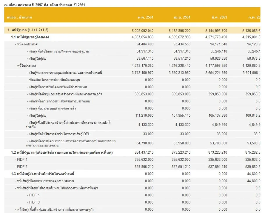 โดยในเดือน พฤษภาคม 2561 พบว่า หนี้รัฐบาลนั้นมีมากถึง 5,202,092 ล้านบาท แยกเป็น หนี้ที่รัฐบาลกู้โดยตรง 4,337,654 ล้านบาท และหนี้ที่รัฐบาลกู้เพื่อชดใช้ความเสียหายให้แก่กองทุนเพื่อการฟื้นฟูฯอีก 864,437 ล้านบาท