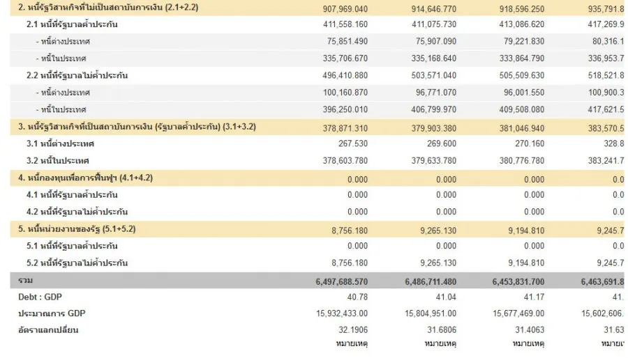 - หนี้สาธารณะคงค้างดังกล่าวแยกเป็นหนี้รัฐบาล 5,202,092 ล้านบาท และหนี้ของรัฐวิสาหกิจ 1,286,840 ล้านบาท