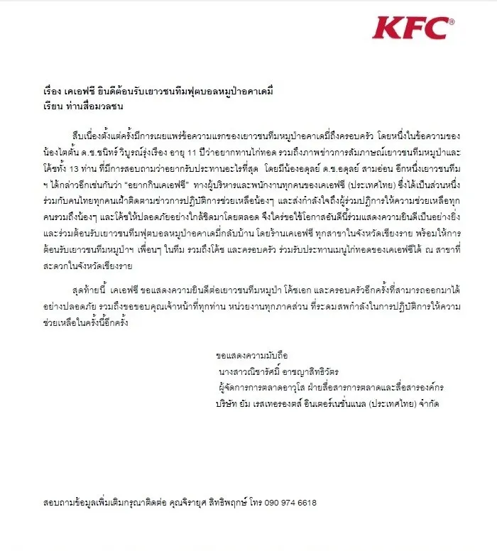 สุดท้ายนี้ เคเอฟซี ขอแสดงความยินดีต่อเยาวชนทีมหมูป่า โค้ชเอก และครอบครัวอีกครั้งที่สามารถออกมาได้อย่างปลอดภัย รวมถึงขอขอบคุณเจ้าหน้าที่ทุกท่าน หน่วยงานทุกภาคส่วน ที่ระดมสรรพกาลังในการปฏิบัติการให้ความช่วยเหลือในครั้งนี้อีกครั้ง