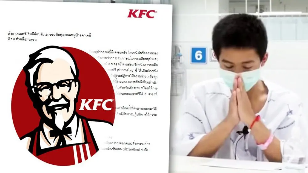 งานนี้ KFC จึงได้เขียนจดหมายตอบกลับน้องๆ ทีมหมูป่าอะคาเดมี โดย KFC ยินดีให้สมาชิกทีมหมูป่าทุกคน เพื่อนๆในทีม รวมถึงโค้ชและครอบครัวไปทานไก่ KFC สาขาไหนก็ได้ในจังหวัดเชียงราย โดยเนื้อหาจดหมายได้ระบุว่า