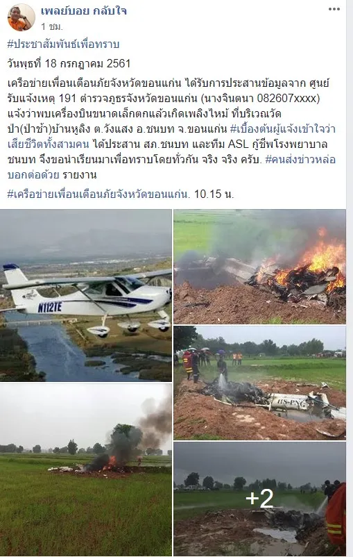 เมื่อเวลา 10.15 น. วันนี้ (18 กรกฎาคม 2561) กลุ่มเฟซบุ๊กเครือข่ายเพื่อนเตือนภัยจังหวัดขอนแก่น. รานงานระบุว่า ได้รับการประสานข้อมูลจาก ศูนย์รับแจ้งเหตุ 191 ตำรวจภูธรจั งหวัดขอนแก่น (นางจินตนา 082607xxxx) แจ้งว่าพบเครื่องบินขนาดเล็กตก แล้วเกิดเพลิงไหม้ ที่บริเวณวัดป่า(ป่าช้า) บ้านหูลิง ต.วังแสง อ.ชนบท จ.ขอนแก่น