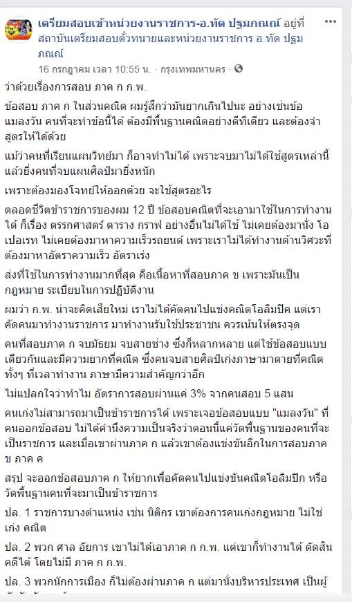 ผมว่า ก.พ. น่าจะคิดเสียใหม่ เราไม่ได้คัดคนไปแข่งคณิตโอลิมปิค แต่เราคัดคนมาทำงานราชการ มาทำงานรับใช้ประชาชน ควรเน้นให้ตรงจุด