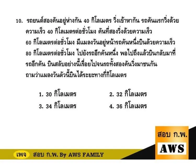 รถยนต์2คัน..จอดห่างกัน40กม. คันแรกขับด้วยความเร็ว40กม./ชม. คันที่สองขับด้วยความเร็ว60กม./ชม. ทั้งสองคันขับเข้าหากัน มี #แมลงวันตัวหนึ่ง บินด้วยความเร็ว80กม./ชม. บินไปบินมาระหว่างรถคันแรกและคันที่สอง บินไปบินมาอยู่อย่างนั้น อยากทราบว่า รถทั้งสองคันขับมาเจอกันแมลงวันต้องบินทั้งหมดกี่กิโลเมตร