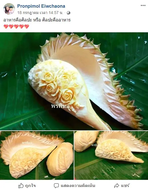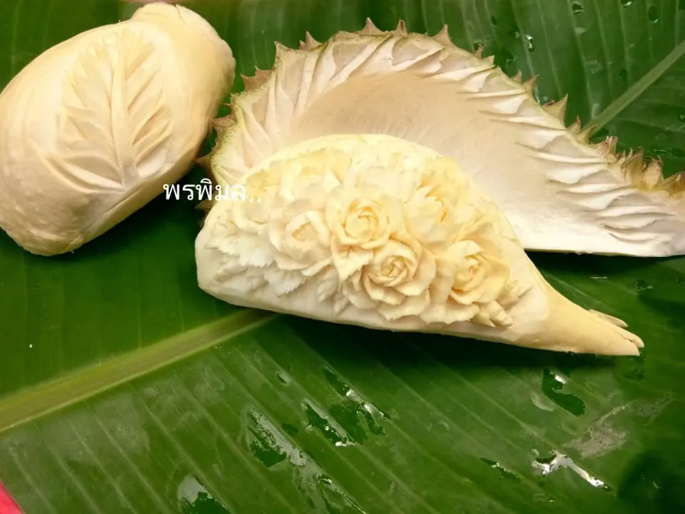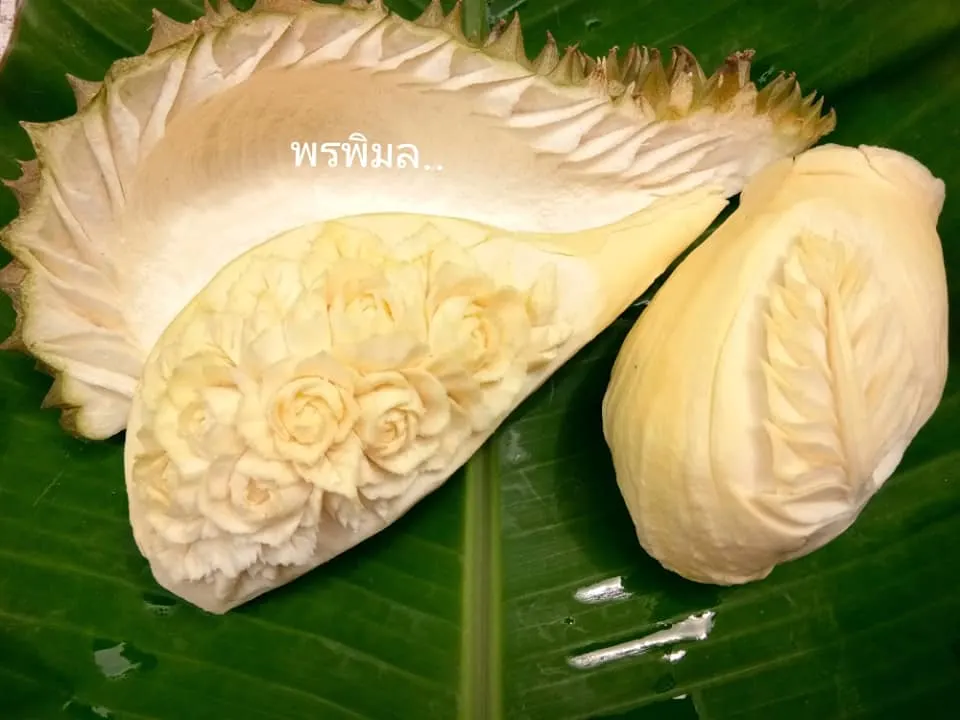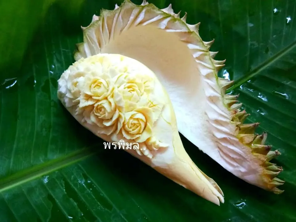 เรื่องการแกะสลักผักผลไม้นั้น คนไทยเรามีฝีมือด้านนี้มาช้านานแล้ว แต่ใครจะคิดว่าแม้แต่ทุเรียน คนไทยก็สามารถแกะสลักได้ แถมยังออกมาสวยงามถึงขนาดนี้อีกด้วย โดย นี่ คือฝีมือของคุณ Pronpimol Eiwchaona