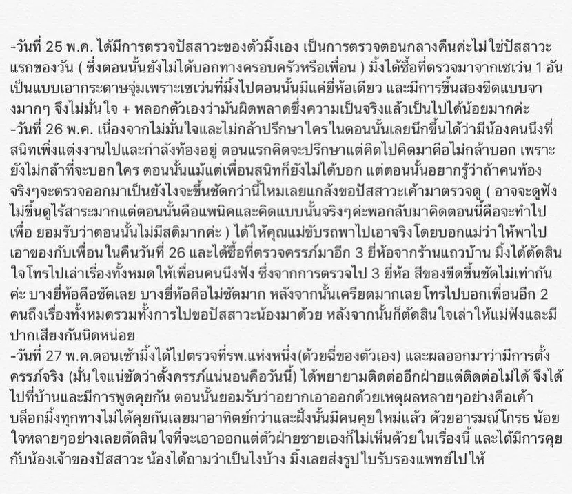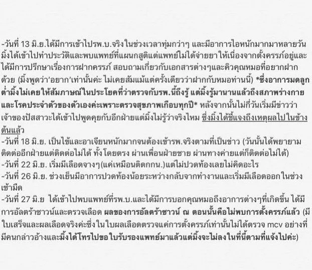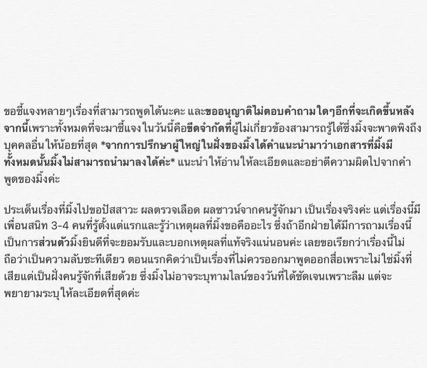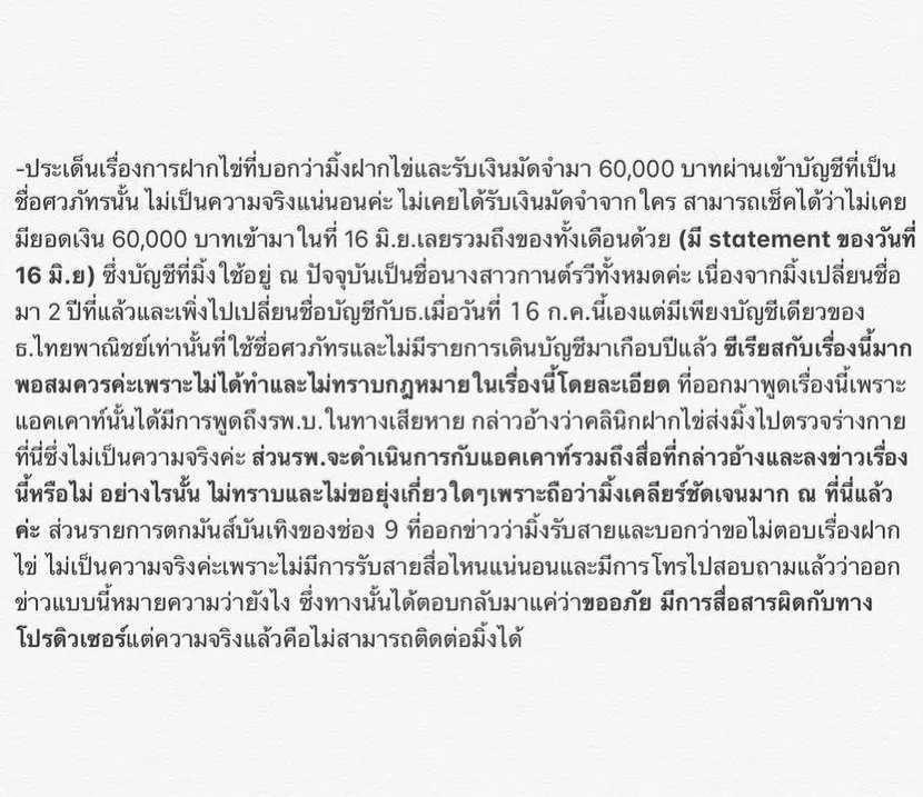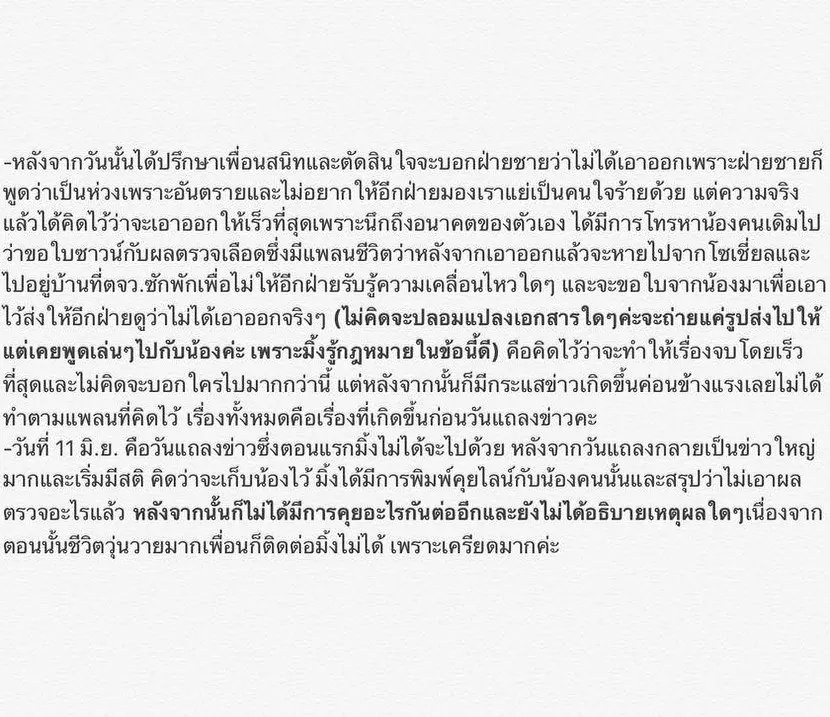 ล่าสุดวันนี้ 20 กรกฎาคม 2561 สาวมิ้งออกมาชี้แจงทุกประเด็นที่คนสงสัยผ่าน IG ส่วนตัว โดยระบุว่าตนเองแท้งแล้ว โดยชี้แจงประเด็นต่างๆดังนี้