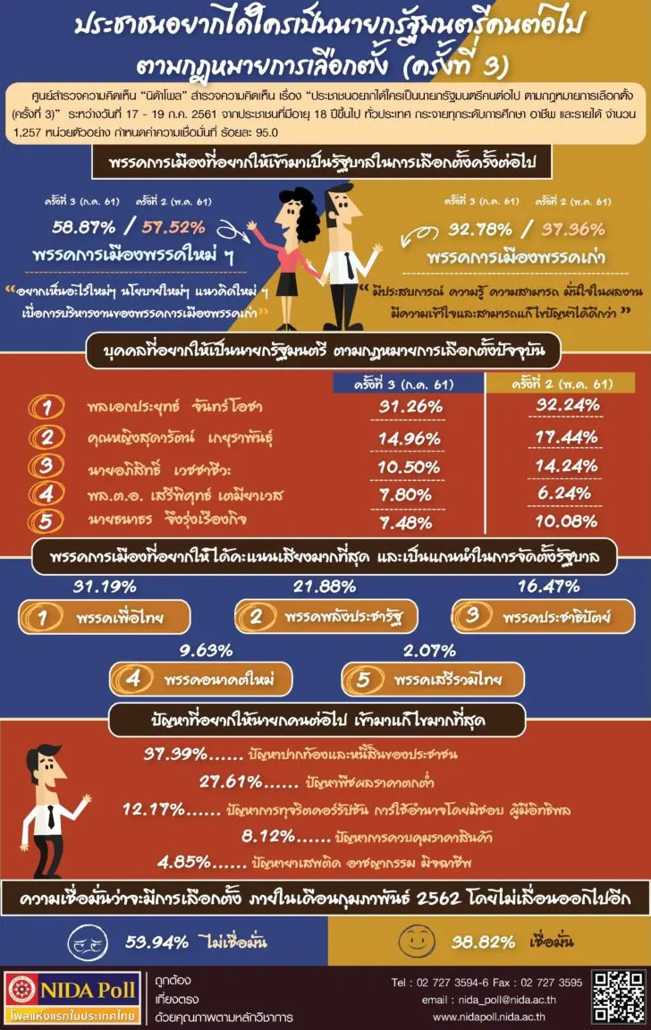 ศูนย์สำรวจความคิดเห็น “นิด้าโพล” สถาบันบัณฑิตพัฒนบริหารศาสตร์ (นิด้า) เปิดเผยผลสำรวจความคิดเห็นของประชาชนเรื่อง “ประชาชนอยากได้ใครเป็นนายกรัฐมนตรีคนต่อไป ตามกฎหมายการเลือกตั้งปัจจุบัน (ครั้งที่ 3)” ทำการสำรวจระหว่าง วันที่17-19 กรกฎาคม 2561 จากประชาชน ที่มีอายุ 18 ปีขึ้นไป กระจายทุกภูมิภาค ระดับการศึกษาและอาชีพทั่วประเทศรวมทั้งสิ้น จํานวน 1,257 หน่วยตัวอย่าง เกี่ยวกับประชาชนอยากได้ใครเป็นนายกรัฐมนตรีคนต่อไป ตามกฎหมายการเลือกตั้งปัจจุบัน