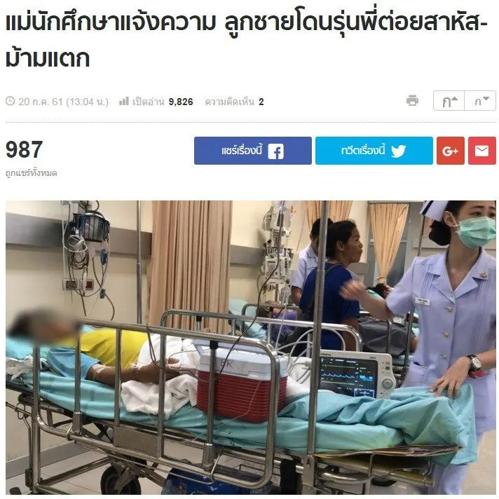 ที่มา: ที่มา: แม่นักศึกษาแจ้งความ ลูกชายโดนรุ่นพี่ต่อยสาหัส-ม้ามแตก https://www.sanook.com/news/7250014/
