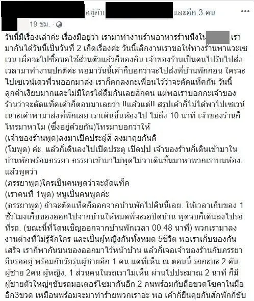 และให้เวลาไปเก็บของ 1 ชั่วโมง พร้อมไล่พวกเธอ 5 คนออกจากบ้านในคืนนั้นเลย ซึ่งตอนนั้นเป็นเวลาเที่ยงคืนกว่าแล้ว แถมเจ้าของร้านยังขู่ห้ามเอาเรื่องไปโพสท์กล่าวว่าร้านด้วย ทำให้พวกเธอยิ่งโมโหเป็นอย่างมาก เพราะเป็นผู้หยิง 5 คนถูกไล่ออกกลางดึก ในต่างถิ่นที่ไม่คุ้นเคย ซึ่งเธอได้โพสท์รายละเอียดไว้ว่า