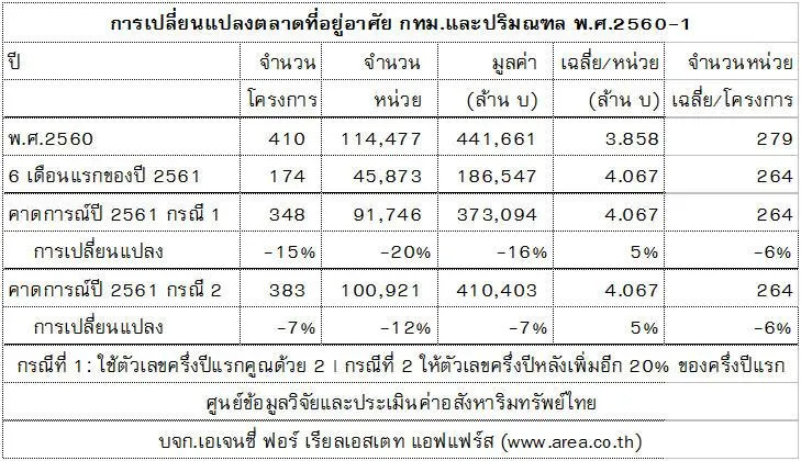 และเมื่อนำผลครึ่งแรกของปีมาประมาณการทั้งปี จะพบว่า คาดการณ์ปี 2561 จะมีโครงการเปิดใหม่ 383 โครงการ รวม 100,921 หน่วย ในมูลค่ารวม 410,403 ล้านบาท และแต่ละโครงการจะมีขนาด 264 หน่วย เมื่อเทียบกับปี 2560 ทั้งปี ปรากฏว่าปี 2560 มีเปิดตัวใหม่ 410 โครงการ รวม 114,477 หน่วย รวมมูลค่า 441,661 หรือเฉลี่ยหน่วยละ 3.858 ล้านบาท ทั้งนี้แต่ละโครงการมีจำนวน 279 หน่วย เมื่อเทียบกันแล้ว ก็ปรากฏว่า จำนวนโครงการทั้งปี 2560 จะลดลงกว่าปีก่อน -7% จำนวนหน่วยจะลดลง -12% และมูลค่าจะลดลง -7% และขนาดโครงการก็จะลดลง -6%