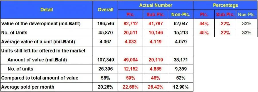 หากพิจารณาในแง่ของจำนวนหน่วย บริษัทมหาชนทั้งหมดเปิดตัวประมาณ 45% ของหน่วยขายทั้งหมด และบริษัทในเครืออีก 22% รวมจำนวน 30,657 หน่วย (67%) ของจำนวนทั้งหมด ตัวเลขนี้ชี้ชัดว่า บริษัทมหาชนเปิดตัวโครงการต่างๆ มากขึ้น และพัฒนาจำนวนหน่วยต่อโครงการมากขึ้น โดยเฉพาะการพัฒนาอาคารชุดและทาวน์เฮ้าส์ซึ่งมีขนาดโครงการจำนวนมากขึ้น หรับยอดขายของที่อยู่อาศัยที่เปิดใหม่ ณ กลางปี 2561 มียอดขายเฉลี่ยที่ 20.26% ต่อเดือน โดยจะพบว่า บริษัทในเครือมหาชนขายได้ 26.42% ต่อเดือน บริษัทมหาชนได้ 26.42% ส่วนของบริษัททั่วไปขายได้สูงถึงประมาณเดือนละ 12.90% ต่อเดือน ซึ่งถือว่ายอดขายของบริษัทมหาชน และบริษัทในเครือจะขายได้ดีกว่าบริษัทพัฒนาที่ดินทั่วไป
