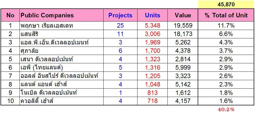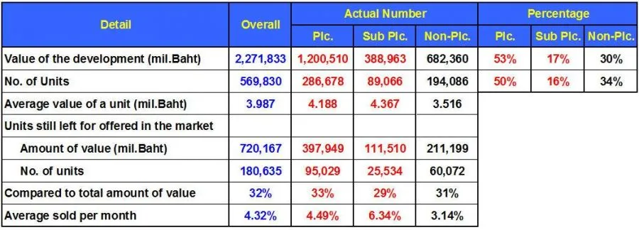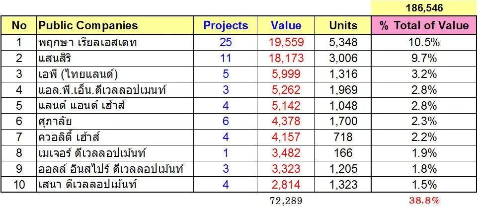 พิจารณาภาพรวมของที่อยู่อาศัยที่ยังเปิดขายอยู่ทั้งหมด ณ กลางปี 2561 จะพบว่าบริษัทมหาชนมีสัดส่วนมูลค่าสูงถึง 53% และมีจำนวนหน่วย 50% ของทั้งตลาด และบริษัทมหาชนส่วนใหญ่สามารถผลิตที่อยู่อาศัยที่มีระดับราคาสูงกว่าบริษัทนอกตลาด ซึ่งเน้นการผลิตจำนวนหน่วยขายจำนวนมากแต่มีแบรนด์ จึงส่งผลให้มีสัดส่วนของมูลค่าโครงการในตลาดสูงกว่าบริษัททั่วไป โดยมีราคาขายเฉลี่ยที่ 4.188 ล้านบาท ซึ่งสูงกว่าราคาเฉลี่ยต่อหน่วยของบริษัทนอกตลาดหลักทรัพย์ที่มีราคาเฉลี่ย 3.516 ล้านบาท