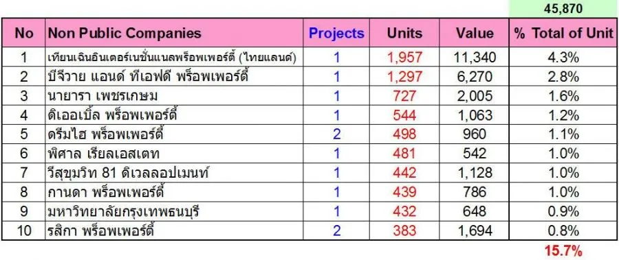 ตามตาราง 8.3.2 หากพิจารณาในส่วนของบริษัท จำกัด หรือบริษัททั่วไปที่อยู่นอกตลาดหลักทรัพย์ จะพบว่า อันดับ 1 คือ บริษัท เทียนเฉินอินเตอร์เนชั่นแนลพร็อพเพอร์ตี้ (ไทยแลนด์) จำกัด มีการเปิดขายหน่วยขาย 1,957 หน่วย อันดับ 2 คือ บริษัท บีจีวาย แอนด์ ทีเอฟดี พร็อพเพอร์ตี้ จำกัด จำนวน 1,297 หน่วย และอันดับ 3 คือ บริษัท นายารา เพชรเกษม จำกัด จำนวน 727 หน่วย ถ้านับจำนวนหน่วยรวมที่เปิดใหม่กลางปี 2561 ก็จะพบว่า 3 บริษัทนี้ เปิดตัวเป็นสัดส่วน 4.3%, 2.8% และ 1.6% ตามลำดับ