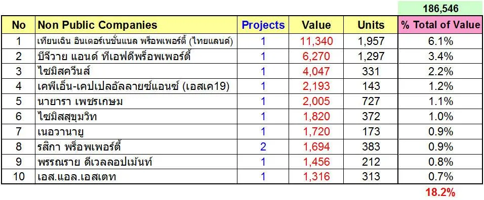 ตามตารางที่ 8.3.4 พิจารณาจำนวนมูลค่าของบริษัทจำกัด จะพบว่า บริษัท เทียนเฉิน อินเตอร์เนชั่นแนล พร็อพเพอร์ตี้ (ไทยแลนด์) จำกัด มีมูลค่ามากที่สุด คือ 11,340 ล้านบาท รองลงมาคือ บริษัท บีจีวาย แอนด์ ทีเอฟดีพร็อพเพอร์ตี้ จำกัด มีมูลค่า 6,270 ล้านบาท และอันดับ 3 คือ บริษัท ไซมิสควีนส์จำกัด จำนวน 4,047 ล้านบาท ถ้าเอาจำนวนรวมมูลค่าที่เปิดใหม่กลางปี 2561 คือ 186,546 ล้านบาท ก็จะพบว่า 3 บริษัทนี้เปิดตัวเป็นสัดส่วน 6.1%, 3.4% และ 2.2% ตามลำดับ