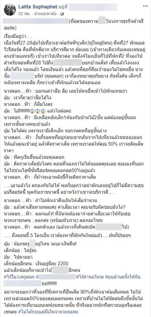 30 กรกฎาคม 2561 เฟซบุ๊กคุณ Lalita Sophaphet โพสท์เล่าเหตุการณ์ วันหยุดพักผ่อนที่แสนจะเฟล ด้วยเหตุที่ครอบครัวของเธอเดินทางไปเที่ยวเขาค้อ เมื่อวันที่ 27-28 กรกฎาคม ที่ผ่านมา มีเด็ก 3 คน ผู้ใหญ่ 6 คน คืนแรกที่พักดีมาก บริการดีมาก พอรุ่งเช้าก็ไปเที่ยวต่อจนถึง 4 โมงเย็น