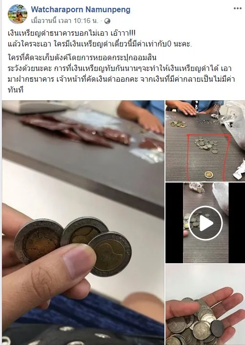 โดยผู้ใช้เฟซบุ๊กที่ชื่อWatcharaporn Namunpeng ได้โพสท์คลิป-ภาพและข้อความระบุว่า เงินเหรียญดำธนาคารบอกไม่เอา เอ๊าาา!!! แล้วใครจะเอา ใครมีเงินเหรียญดำเดี๋ยวนี้มีค่าเท่ากับ 0 นะคะ.