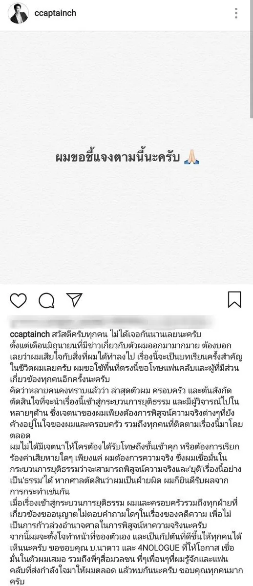 โดยระบุว่า สวัสดีครับทุกคน ไม่ได้เจอกันนานเลยนะครับ ตั้งแต่เดือนมิถุนายนที่มีข่าวเกี่ยวกับตัวผมออกมามากมาย ต้องบอกเลยว่าผมเสียใจกับสิ่งที่ผมได้ทำลงไป เรื่องนี้จะเป็นบทเรียนครั้งสำคัญในชีวิตผมเลยครับ ผมขอใช้พื้นที่ตรงนี้ขอโทษแฟนคลับและผู้ที่มีส่วนเกี่ยวข้องทุกคนอีกครั้งนะครับ