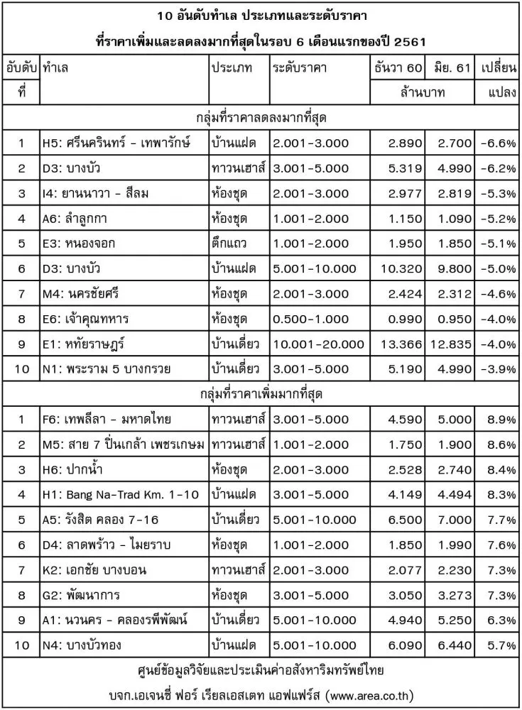 อันดับที่ 1 ในทำเล F6: เทพลีลา - มหาดไทย บ้านประเภท: ทาวนเฮาส์ ณ ระดับราคาประมาณ 3.001-5.000 ล้านบาท หรือ ณ ราคาเฉลี่ยหน่วยละ 4.590 ล้านบาท ได้เพิ่มขึ้นเป็น ราคาเฉลี่ยหน่วยละ 5.000 ล้านบาท หรือเท่ากับเพิ่มขึ้นไป 8.9% ในรอบ 6 เดือนล่าสุด ธันวาคม 2560 - มิถุนายน 2561 ทั้งนี้เป็นเพราะสามารถใช้เป็นทาวน์โฮมสำหรับประกอบกิจการได้