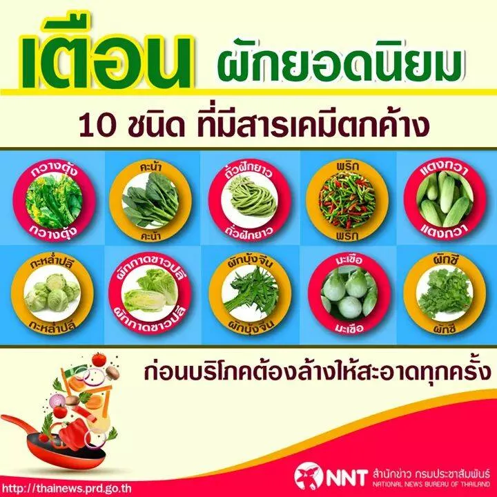 ✅ จากข้อแนะนำดังกล่าว นพ.ดนัย ธีวันดา รองอธิบดีกรมอนามัย กล่าวว่าการกินผักเป็นประจำส่งผลดีต่อสุขภาพ แต่สิ่งที่น่าเป็นห่วงก็คือ ปัญหาการตกค้างของสารเคมีหรือยาฆ่าแมลงซึ่งเป็นอันตรายต่อร่างกาย ซึ่งข้อมูลจากการตรวจการตกค้างของสารเคมีอยู่ในพืชผักที่จำหน่ายในท้องตลาดพบว่า มีผักสด 10 ชนิดที่มีการตกค้างของสารเคมีกำจัดศัตรูพืชในปริมาณสูงได้แก่ กวางตุ้ง คะน้า ถั่วฝักยาว พริก แตงกวา กะหล่ำปลี ผักกาดขาวปลี ผักบุ้งจีน มะเขือ และผักชี
