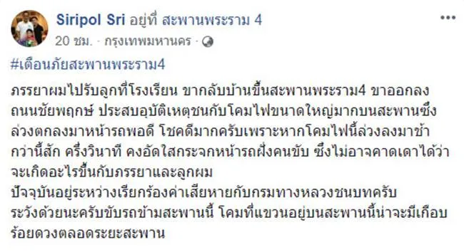 เจ้าของโพสต์ คุณศิริพล ศรีกาญจนเพริศ เปิดเผยว่า ตอนแรกที่ขับรถชนนั้น ก็ไม่รู้ว่าชนอะไร แต่ช่วงดานหน้าพังเสียหาย พอเปิดกล้องหน้ารถก็ตกใจมากที่เป็นโคมไฟ ดังนั้นจึงได้ติดต่อกรมทางหลวงเพื่อขอให้ทางกรมตรวจสอบ แต่ทางกรมก็ไม่เคยติดต่อกลับมา