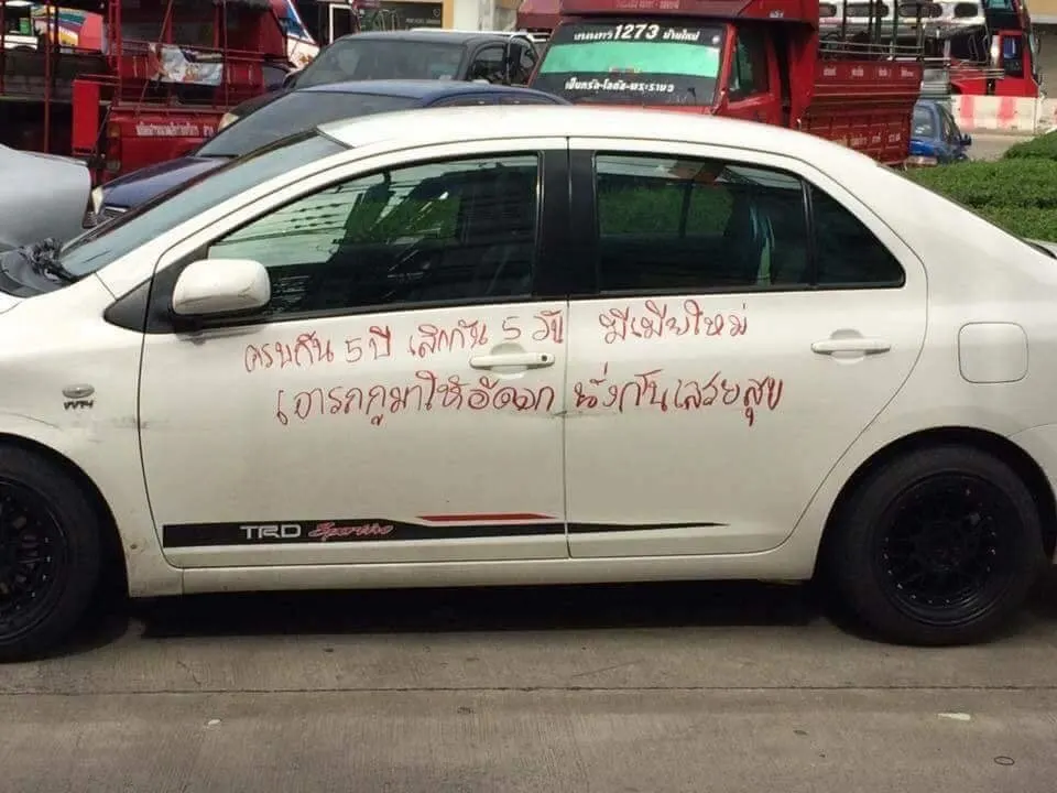 โดยในภาพเป็นข้อความ ที่คล้ายว่าเป็นฝีมือฝ่ายหญิง ที่ละเลง เขียนรถ ด้วยตัวหนังสือสุดเดือด ถึงฝ่ายชายที่คาดว่าจะเป็นแฟนเก่า โดยบริเวณฝากระโปรงหน้าระบุข้อความว่า “ผู้ชายหน้าตัวเมีย พอได้ทุกอย่างแล้วถีบหัวส่งกู หน้า_ี”