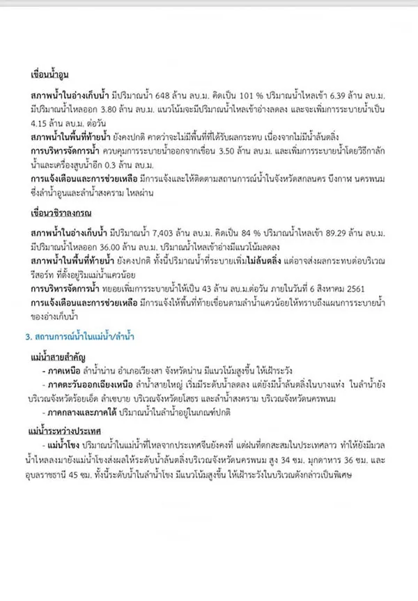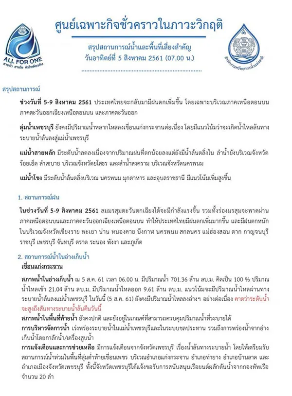 ขอให้ประชาชนที่อยู่ริมสองฝั่งแม่น้ำเพชรบุรี ตั้งแต่พื้นที่ท้ายน้ำ อำเภอแก่งกระจาน อำเภอท่ายาง อำเภอบ้านลาด อำเภอเมือง และอำเภอบ้านแหลม ให้ยกของขึ้นที่สูงเนื่องจากวันที่ 5 ส.ค.61 น้ำจะล้นสปริลเวย์ โดยมวลน้ำจะไหลเข้าถึงพื้นที่ดังกล่าวภายในช่วงเที่ยงวันจันทร์ที่ 6 ส.ค. 2561 นี้