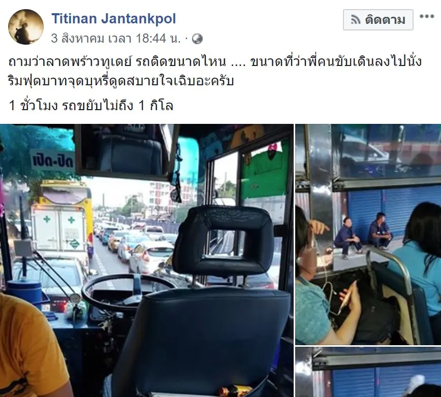 คุณ Titinan Jantankpol ได้โพสภาพ ที่อธิบายถึงสภาพจราจรติดขัดในเมืองไทยที่เกิดขึ้นบนถนนลาดพร้าวได้เป็นอย่างดี ถึงขั้นที่พนักงานขับรถ และพนักงานประจำรถ ลงไปนั่งเล่นริมฟุตบาทเพื่อรอให้การจราจรเคลื่อนไปได้