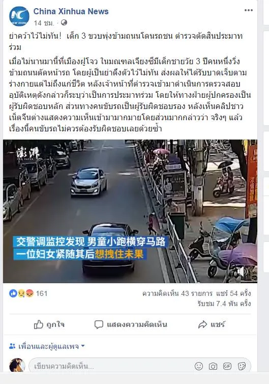 เมื่อไม่นานมานี้ที่เมืองฝูโจว ในมณฑลเจียงซีมีเด็กชายวัย 3 ปีคนหนึ่งวิ่งข้ามถนนตัดหน้ารถ โดยผู้เป็นย่าดึงตัวไว้ไม่ทัน ส่งผลให้ได้รับบาดเจ็บตามร่างกายแต่ไม่ถึงแก่ชีวิต หลังเจ้าหน้าที่ตำรวจเข้ามาดำเนินการตรวจสอบอุบัติเหตุดังกล่าวก็ระบุว่าเป็นการประมาทร่วม โดยให้ทางฝ่ายผู้ปกครองเป็นผู้รับผิดชอบหลัก ส่วนทางคนขับรถเป็นผู้รับผิดชอบรอง หลังเห็นคลิปชาวเน็ตจีนต่างแสดงความเห็นเข้ามามากมายโดยส่วนมากกล่าวว่า จริงๆ แล้วเรื่องนี้คนขับรถไม่ควรต้องรับผิดชอบเลยด้วยซ้ำ