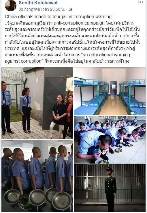 รัฐบาลจีนออกกฎเรียกว่า anti-corruption campaign โดยให้ผู้บริหารระดับสูงและครอบครัวไปเยี่ยมคุกและอยู่ในคุกอย่างน้อย1วัน เพื่อให้ได้เห็นการใช้ชีวิตหลังกำแพงสูงและลูกกรงเหล็ก อีกทั้งยังให้พบปะกับอดีตข้าราชการ ซึ่งกำลังรับโทษอยู่ในคุก เนื่องจากการคอรัปชั่น..