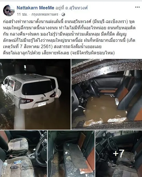 “ก่อสร้างทำทางมาตั้งนานล่ะเส้นนี้ ถนนสุวินทวงศ์ (มีนบุรี-ฉะเชิงเทรา) ขุดหลุมใหญ่ลึกขนาดนี้กลางถนน ทำไมไม่มีที่กั้นอะไรหน่อย ถนนกับหลุมติดกัน กลางคืน+ฝนตก มองไม่รู้ว่ามีหลุมน้ำท่วมเต็มหลุม มืดก็มืด สัญญลักษณ์ก็ไม่มีจะรู้ได้ไงว่าหลุมใหญ่ขนาดนี้อ่ะ ฝนก็หนักมากเมื่อวานนี้ (เกิดเหตุวันที่ 7 สิงหาคม 2561) สงสารรถจังดื่มน้ำเยอะเลย ดีนะไม่เอาลูกไปด้วย เสียหายพังเลย (จะมีใครรับผิดชอบไหม)”