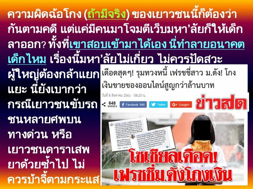 ความผิดฉ้อโกง (ถ้ามีจริง) ของเยาวชนนี้ก็ต้องว่ากันตามคดี แต่แค่มีคนมาโจมตีเว็บมหา’ลัยก็ให้เด็กลาออก? ทั้งที่เขาสอบเข้ามาได้เอง นี่ทำลายอนาคตเด็กไหม เรื่องนี้มหา’ลัยไม่เกี่ยว ไม่ควรปัดสวะ ผู้ใหญ่ต้องกล้าแยกแยะ นี่ยังเบากว่ากรณีเยาวชนขับรถชนหลายศพบนทางด่วน หรือเยาวชนดาราเสพยาด้วยซ้ำไป ไม่ควรบ้าจี้ตามกระแส