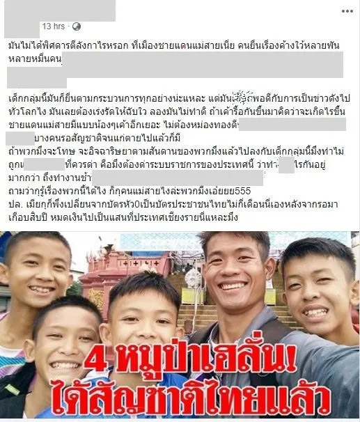 หลังจากโค้ชเอกและน้องทีมหมูป่าได้รับสัญชาติไทยเมื่อวานที่ผ่านมา ก็มีหนุ่มคนหนึ่งที่แม่สายออกมาแสดงความคิดเห็นที่น่าสนใจว่าที่แม่สายยังมีคนที่ยื่นเรื่องขอสัญชาติอีกหลายพันหลายหมื่นคน แต่ก็ไม่ได้โทษน้องๆทีมหมูป่า แต่ต้องโทษระบบ โดยได้โพสท์ข้อความไว้ว่า