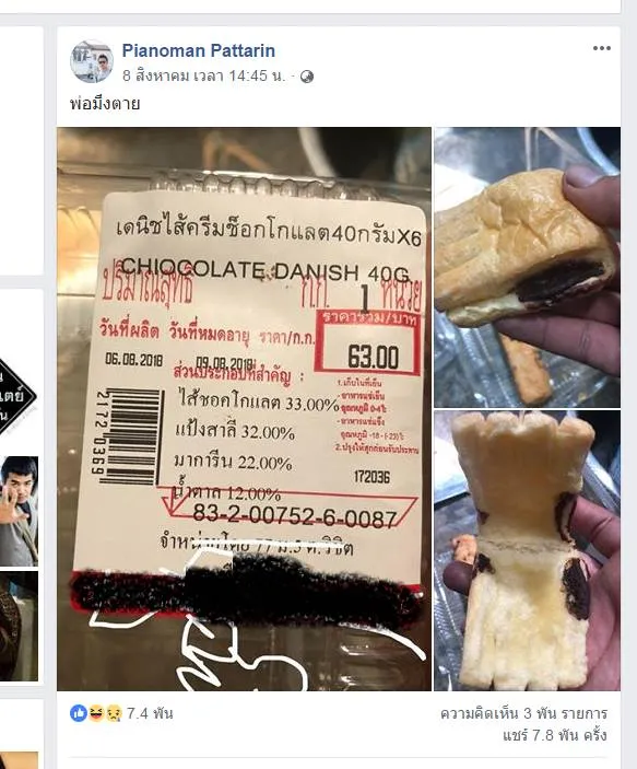 เมื่อวันที่ 8 /8/2561 ทางเฟซบุ้คคุณ Pianoman Pattarin ได้โพสต์ ภาพ ขนมปังแดนิชไส้ช็อกโกแลต ที่ซื้อมาจากห้างดัง