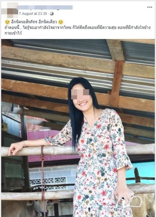 โพสต์ของผู้เสียชีวิต เมื่อวันที่ 7 ส.ค. ที่ผ่านมา เขียนข้อความไว้ว่า “อีกนิดเดียว ถ้าตอนนี้ไม่รู้จะเอากำลังใจจากที่ไหน ให้คิดถึงตอนที่มีความสุขและตอนที่มีกำลังใจข้างเคียง”
