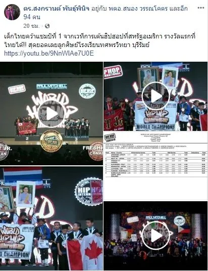 โดยเมื่อวันที่ 12 สิงหาคม 2561 ได้มีผู้ใช้เพสบุ๊คที่มีชื่อว่า “ดร.สงกรานต์ พันธุ์พินิจ” ได้โพสต์ คลิปวีดีโอความประทับใจของเด็กไทย ที่ได้ชนะเลอศการแข่งขัน เต้นฮิปฮอป ที่ประเทศสหรัฐอเมริกา พร้อมรถบุข้อความว่า