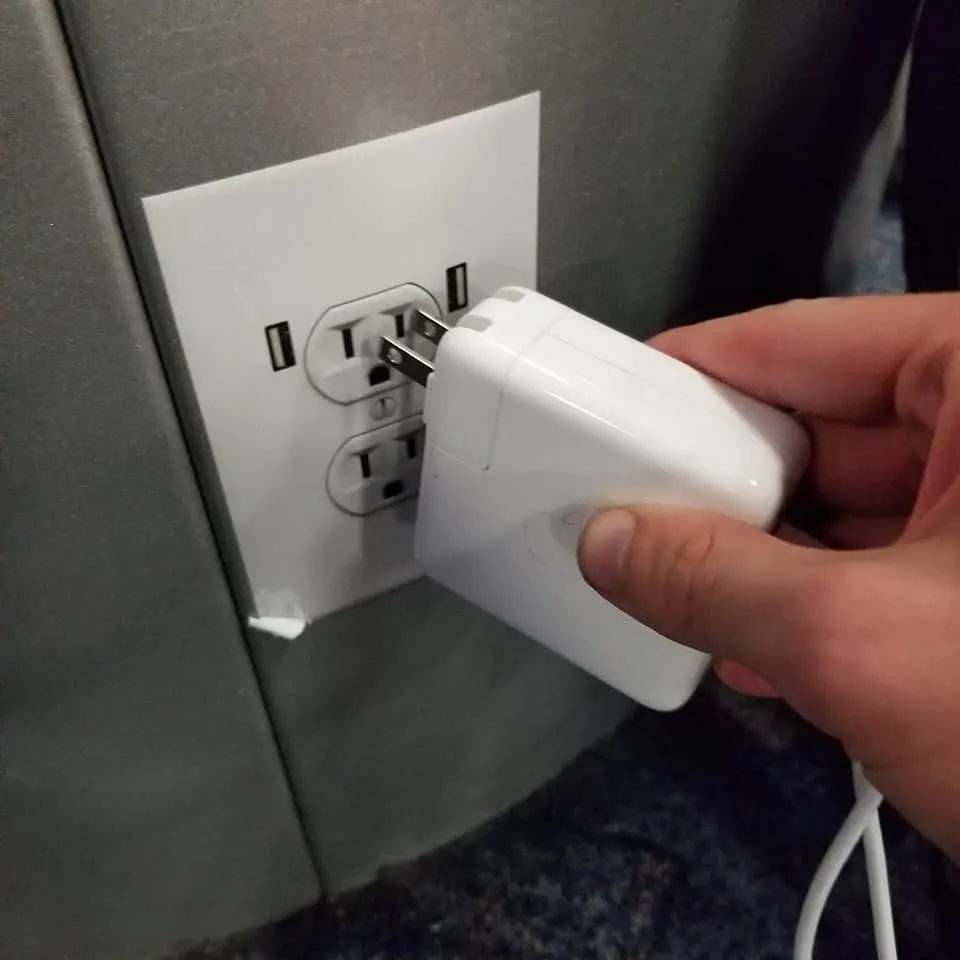 ทำกันได้ลงคอ ผู้คนเสียบผิดเสียบถูก สติ๊กเกอร์รูปปลั๊กไฟระบาดตามสนามบินต่างๆทั่วโลก