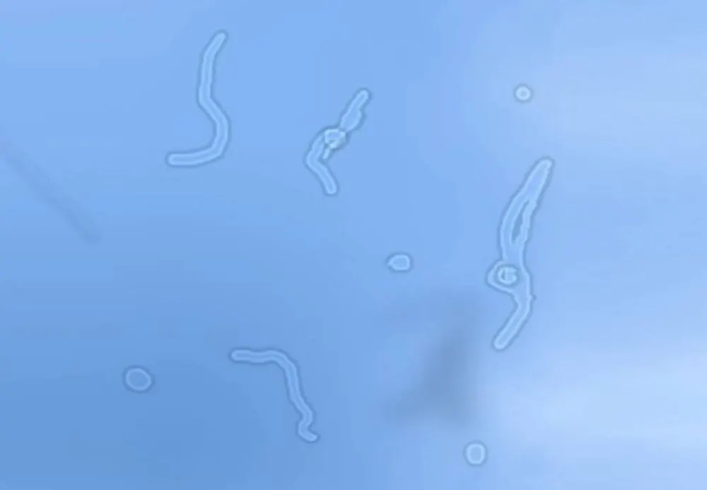9. การมีสารเคมีบางตัวที่เกิดจากการเปลี่ยนแปลงของเส้นใย Synchysis scintillans ในน้ำวุ้นเกิดเป็นผลึกของแคลเซียม หรือ ของไขมันคอเลสเตอรอล ลอยไปลอยมาในน้ำวุ้นได้